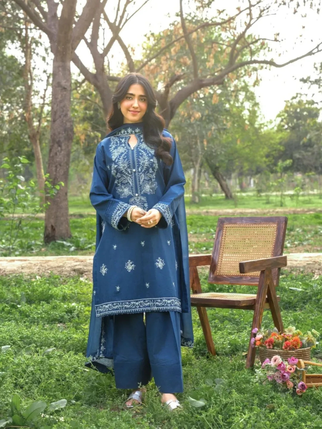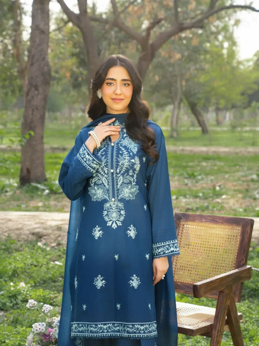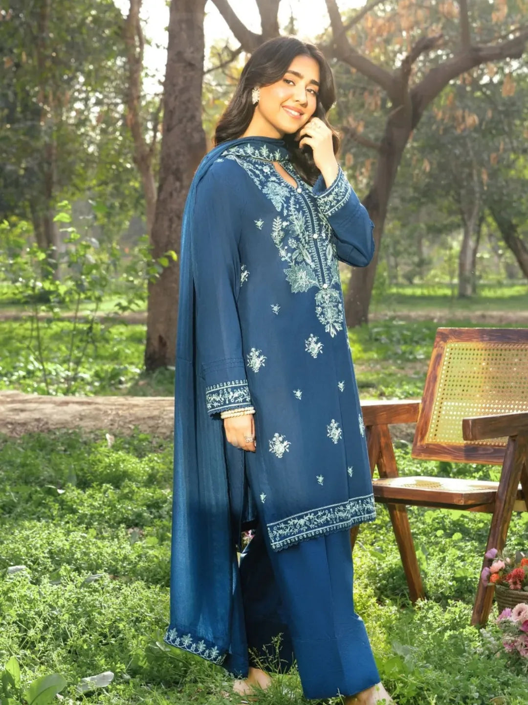 EMB SHIRT + PLAIN FARSHI SHALWAR WITH EMB SHAFFON DUPPTA
