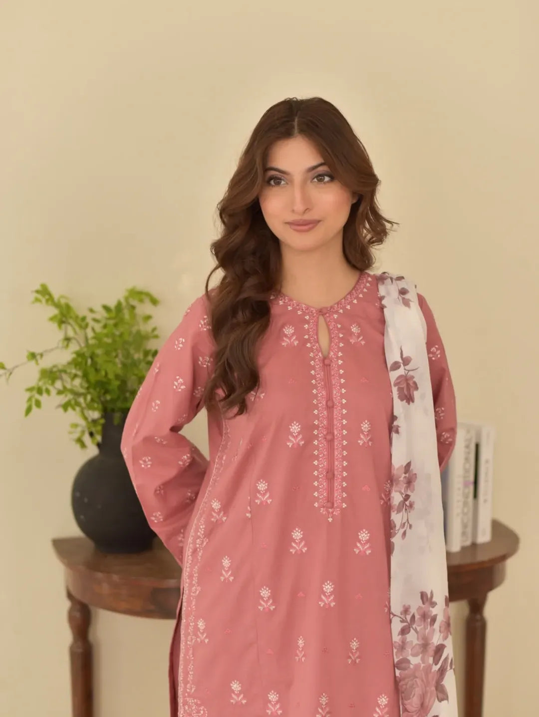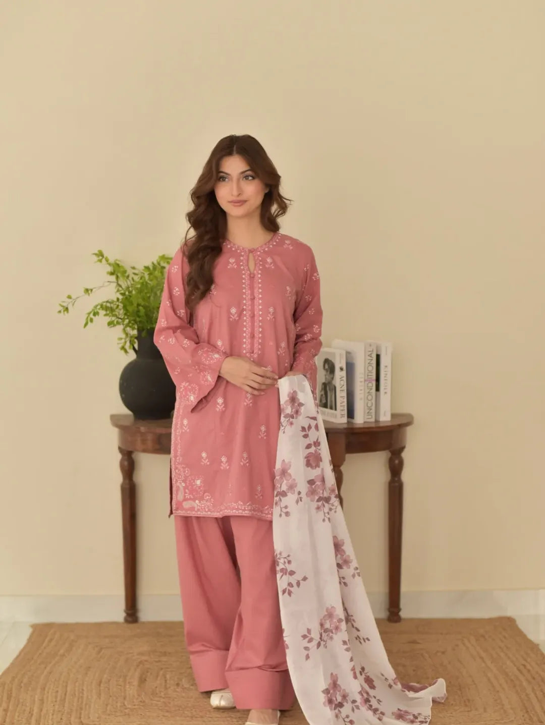 EMB SHIRT + PLAIN FARSHI SHALWAR WITH DIGITAL SHAFFON DUPPTA